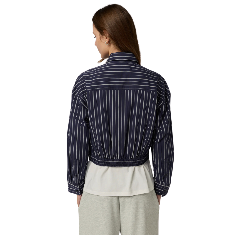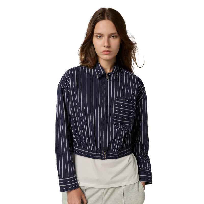 เสื้อเชิ้ตลายทางสั้นทรงครอป มีซิปด้านหน้า ผสมผสานความเนี้ยบเข้ากับทรงหลวมสบาย ลายทางแนวตั้งช่วยเสริมลุคที่ดูสะอาดตาและทันสมัย ในขณะที่ทรงครอปและชายเสื้อยางยืดเพิ่มความอ่อนเยาว์ แมทช์กับกางเกงหรือกระโปรงเอวสูงเพื่อลุคที่สมดุลและดูดีมีระดับ