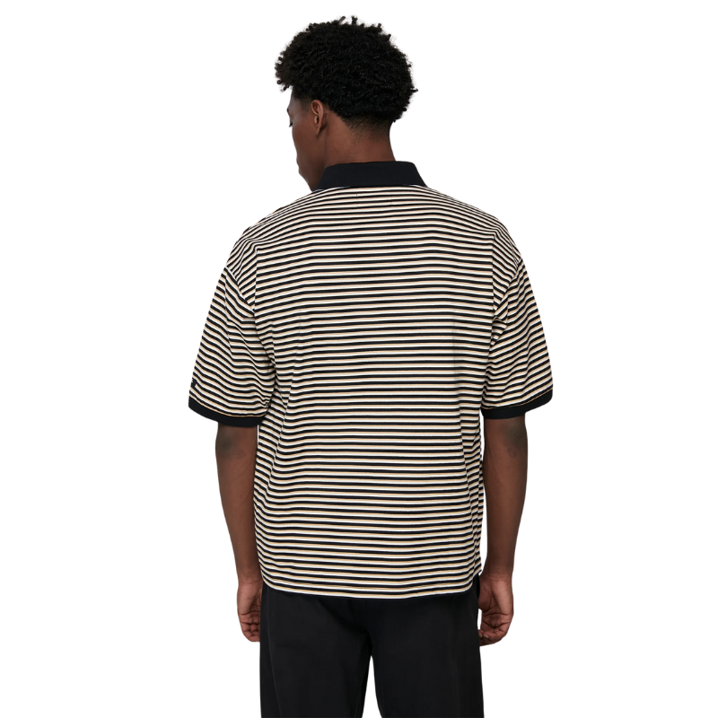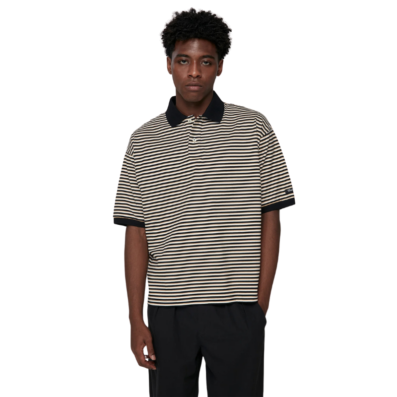 เสื้อโปโลสีดำลายทางทรงหลวมใส่สบาย มีดีเทลลายทางเล็กน้อย เป็นเสื้อโปโลอเนกประสงค์ที่เหมาะสำหรับทั้งโอกาสลำลองและกึ่งทางการ
